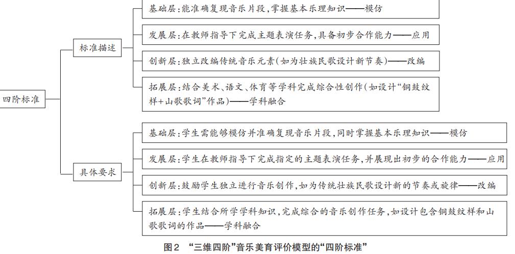 《义务教育艺术课程标准(2022 年版)》(下文简称“新课标”)明确提出,音乐美育要从单一技能训练转向核心素养培育,强调审美感知、艺术表现、文化理解的综合发展。而传统音乐美育评价体系长期存在重结果轻过程、重技能轻素养、重标准轻个性的“三重三轻”问题。本研究对广西部分市县级小学的音乐美育评价情况进行调研发现,多数学校仍以期末演唱、演奏考试作为主要评价方式,忽视学生情感体验与文化认同培养。这种评价模式与新课标要求存在显著差距,无法适应“以美育人”的时代需求。因此,从“问题溯源—理论回应—改革实践—评价创新”的逻辑层面,分析传统音乐美育评价的困境,提出构建“三维四阶”评价模型,并对其进行实践探索,以期为民族地区美育改革提供“扎根实践、指向生长”的可复制样本,促进学生全面发展。