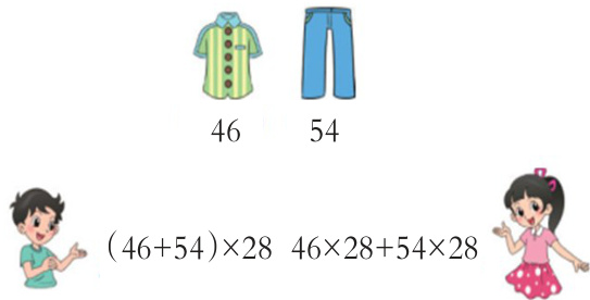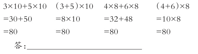 【思考】在解决实际问题的过程中,要求学生能够灵活地运用乘法分配律进行运算是比较困难的。因此,在教学过程中,教师要注意引导学生通过观察算式、写算式、交流、归纳等学习方式发现乘法分配律的基本结构模型,启发学生把注意力聚焦到“乘法意义”上,帮助学生深入理解乘法分配律的本质,用字母表示乘法分配律,充分理解乘法分配律的特点,有意识地将其“凑整”,为今后利用乘法分配律进行简便运算打下基础。