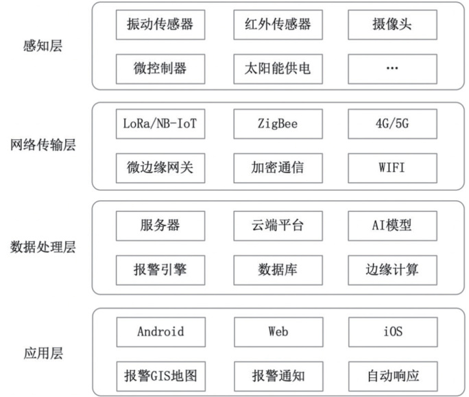 本系统采用分层式架构设计,整体结构分为感知层、网络传输层、数据处理与分析层以及应用层四个层级,各层之间通过标准化接口进行数据交互,确保系统的模块化、可扩展性和高效运行。感知层是系统的基础层,主要由部署在围栏周边的各种传感器组成,包括振动传感器、红外传感器、电磁感应传感器、视频摄像头和环境监测传感器等。这些传感器负责实时采集围栏状态、人员活动、异动行为等关键数据,并将原始数据上传至数据处理单元。该层具备高灵敏度和抗干扰能力,以确保对入侵行为的准确识别。网络传输层负责将感知层采集的数据通过无线通信技术传输至中央服务器。支持多节点组网与自适应路由选择,具有良好的覆盖能力和稳定性,能够在复杂环境中实现低延迟、高可靠性的数据传输。