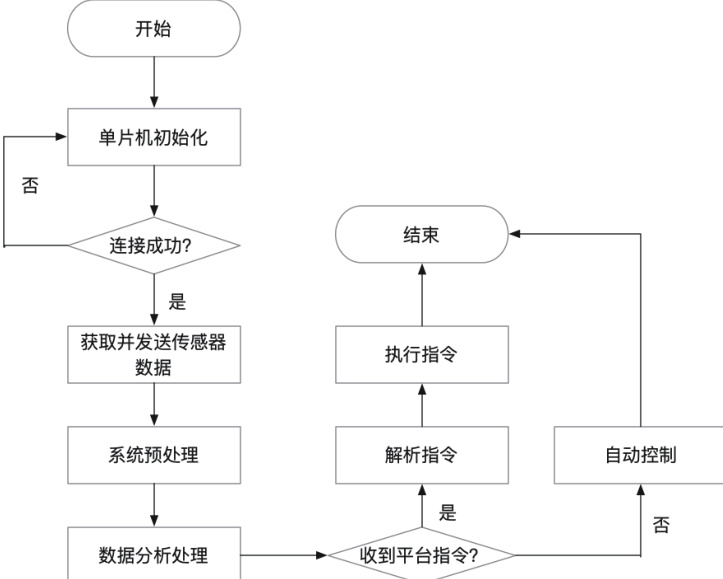 围栏入侵监控管理系统的传感器上位机软件执行流程是一个连续的循环过程,它从单片机初始化开始,通过连接传感器、获取和发送数据、预处理、解析指令、自动控制、数据分析处理,直至接收到平台指令或完成操作。这个流程确保了围栏入侵监控管理系统的检测结果安全和可靠,通过实时监控和智能控制来保证安全。具体的传感器程序执行流程图如图5 所示。