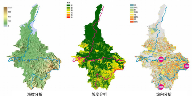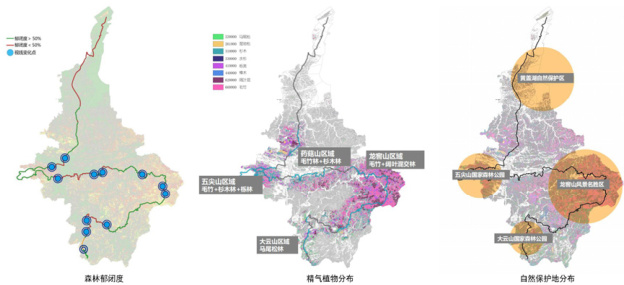 地形空间分析处理(GIS):用 Arcgis 分析临湘市地形地貌、森林郁闭度、精气植物分布、自然保护地分布。结果显示,北部多平原湖泊,南部多山地丘陵;荆竹山、五尖山、龙窖山、大云山区域森林郁闭度高、精气植物和自然保护地多;龙窖山、大云山地势陡峭且部分为地质灾害频发区,选线需避让。