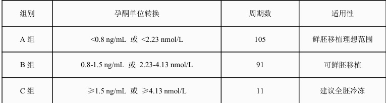 ①鲜胚移植临界值:当孕酮 P> 1.5 ng/mL(4.13 nmol/ )时,鲜胚移植临床妊娠率 <26.5% ,提示此孕酮水平下鲜胚移植结局欠佳,需考虑全胚冷冻策略。
