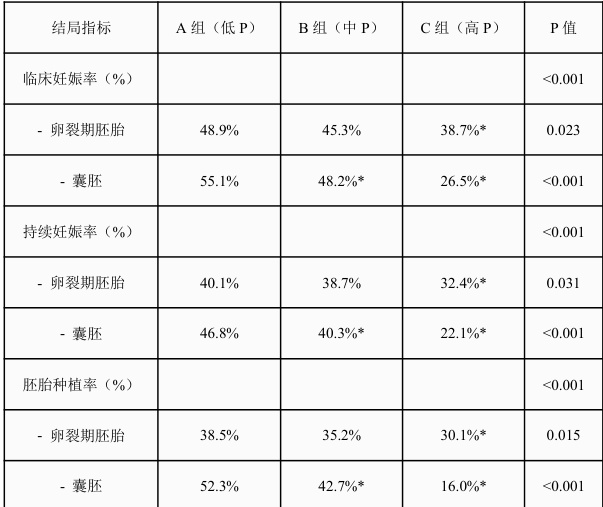 ③ 新增全胚冷冻拓展临界:当孕酮P>1.3 ng/mL(3.56nmol/)时,鲜胚移植妊娠率已开始呈现下降趋势(较P<1.3ng/mL 组下降 12% ,P=0.05 ) 。此时,若患者存在内膜容受性相关高危因素(如反复着床失败史),可提前评估全胚冷冻必要性;当 P>1.5ng/mL 时,建议常规启动全胚冷冻,优化移植结局。