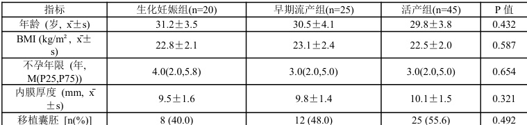 三组患者在年龄、BMI、不孕年限、移植日子宫内膜厚度及移植的胚胎种类方面的差异均无统计学意义(P>0.05),具有可比性。具体数据见表1。
