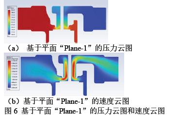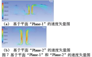 定义平面“Plane-1”,取xy 平面,z 轴坐标为0m。定义平面“Plane-2”,取yz 平面,x 轴坐标为0m。绘制基于平面“Plane-1”的压力云图如图6(a)所示,绘制基于平面“Plane-1”速度云图如图6(b)所示。