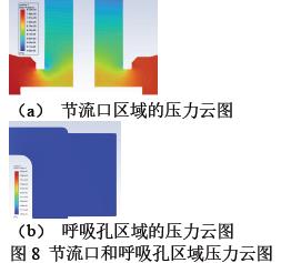 由图8(a)可以看出在节流口附近存在小涡流区,但压缩空气在经过涡流区后压力下降非常均匀,阀体不易产生振动。由图9(b)可以看出呼吸孔附近无涡流区,且压力场分布均匀,减压阀对瞬态工况响应较好。综上所述,该模型在运行时的流场较为稳定,减压阀输出稳定性较好,对瞬态工况有良好响应。