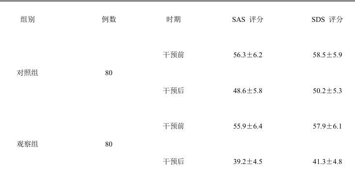 干预前,两组SAS、SDS 评分比较差异无统计学意义 (P>0.05) );干预后,两组评分均下降,且观察组显著低于对照组,差异有统计学意义(P<0.05)。详见表1。