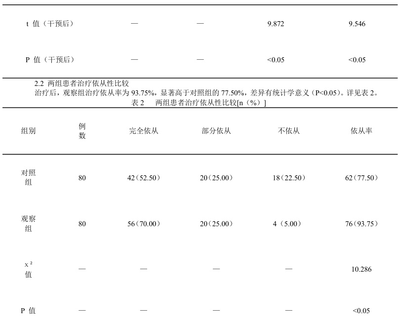对照组采用常规护理管理模式。观察组在常规护理基础上实施人文关怀干预模式,具体措施如下:(1)护士培训。明确说明对执行护士进行专门培训,培训内容包括人文关怀理念、心理疏导技巧,如焦虑抑郁情绪识别与干预方法、共情沟通话术包含礼貌用语规范、倾听技巧等、个性化护理方案制定要点等。通过理论考核、情景模拟考核、护患沟通满意度调查等方式评估培训效果,确保护士具备相应干预能力。(2)环境人文优化。打造舒适的医疗环境,比如创建家庭病房,时时刻刻保持环境的整洁,增强通风,设置健康教育角,提供结核病科普手册、康复案例故事、心理疏导室;在病房张贴鼓励性标语,允许患者携带少量个人物品,增强归属感。(3)个性化心理疏导。患者入院后由责任护士通过一对一访谈评估心理状态,针对焦虑、抑郁等情绪制定干预方案。每周1 次,每次60-90 分钟,持续整个住院周期。患者入院后24 小时内完成首次评估,之后每周1 次,若患者情绪波动较大则增加至每周2-3 次。入院时制定初始计划,之后每两周根据患者病情变化、恢复情况及反馈调整1 次,遇特殊情况随时调整。另外,开展团体心理辅导,邀请康复患者分享经验,缓解孤独感和病耻感;对情绪波动较大者,联合心理医师进行专业干预。(4)精细化护理服务。根据患者年龄、文化程度、病情特点制定个性化护理计划。如对老年患者简化用药指导流程,对年轻患者提供在线康复指导;关注患者生活需求,协助解决饮食、家庭照护等实际问题,如为贫困患者链接社会援助资源。(5)人文式健康宣教。改变传统单向灌输模式,通过互动和通俗讲解让患者更清晰了解疾病与治疗的重要性、家属参与、精细化护理,满足患者实际需求,减少因不便而放弃治疗的情况等方面具体分析,说明各措施如何协同提升患者的治疗依从性。(6)共情式护患沟通。规范护理人员沟通技巧,要求沟通时使用礼貌用语、保持眼神交流,主动倾听患者诉求;操作前耐心解释目的,操作中关注患者感受,操作后及时反馈结果,增强患者信任感。(7)质量控制措施。成立质控小组,由护士长牵头,每周随机抽查10-15 例患者,通过查看护理记录、与患者及家属访谈等方式,核查干预措施是否按方案执行。建立干预日志制度,护士详细记录各项措施的实施时间、内容及患者反应,质控小组定期审核日志,对未达标的环节及时督促整改。每月召开护理质量分析会,汇总质控中发现的问题,针对性优化干预流程,确保80 例患者均接受标准化干预。