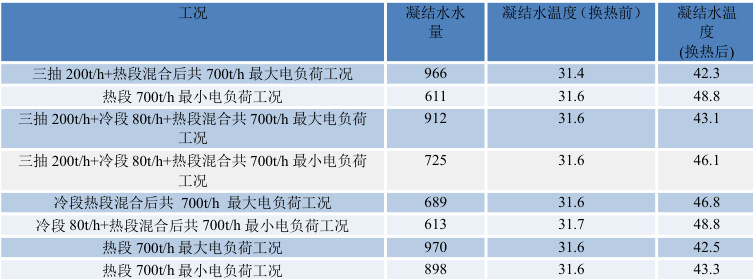 表 2-1 显示了超超临界机组在 700t/h 工业抽汽下的凝结水量、温度参数及换热后的凝结水温度参数,详见下表: