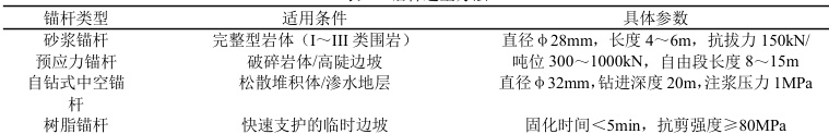 首先,根据《水电工程锚杆技术规范》(DL/T5181-2024),锚杆选型要符合地质条件、荷载需求和变形控制目标,选型方法见表1。本工程采用砂浆锚杆+预应力锚索复合支护,锚杆倾角15°交错布置[1]。