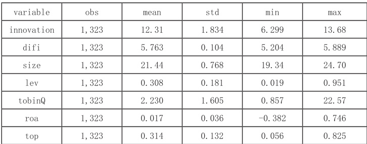 表 1 详细呈现了本文研究框架中因变量、自变量及控制变量的基本统计特征,为后续回归分析提供了数据支撑。具体而言,因变量选择企业当年申请的专利数量对数作为创新产出的代理指标,其均值为 12.31,标准差为 1.834,。核心自变量数字金融发展水平采用对数化处理后的综合指数衡量,其均值为5.763,标准差仅为0.104。其余变量的取值均在合理水平内。