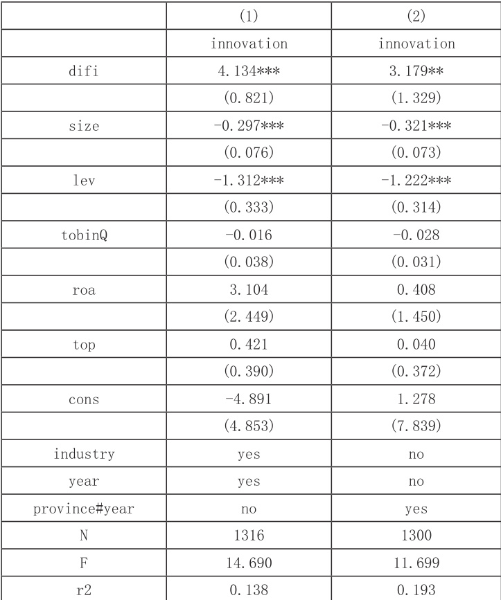 4.3 稳健性分析首先,针对异方差问题可能导致的标准误估计 差假设下的普通最小二乘标准误,以修正可能存在的方差非齐性。列(1)的回归结果显示, 融的边际回归系数为4.131,与基准回归结果高度一致。