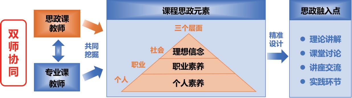 如图2所示,“双师协同”即专业课的主讲教师和思想政治课的主讲教师密切配合、同向发力。首先,由专业课教师系统梳理课程的核心知识点、专业素养点,初步挖掘课程思政元素;然后,联合校内外的思想政治课主讲老师,通过课程内容介绍和交流研讨等方式,从国家战略、国内外专业技术发展史、现实事件、相关人物事迹等方面,共同挖掘蕴藏在专业课教学中的德育内涵与思政元素;接着,将课程思政元素按照个人修养、职业素养、理想信念三个层面进行分类。其中,个人修养层面包括培养学生自强不息的人生态度、学习内驱力、思辨能力和审美素养等,职业素养层面包括职业道德、敬业精神、工匠精神和诚实守信等,理想信念层面包括弘扬民族精神传承中华文化,培养学生家国情怀、民族认同感和归属感等。由专业教学内容精准切入思政教育,形成“个人、职业、社会”三个维度的育人教学资源;最后,根据学生的成长规律及课程知识点统筹设计规划,精准设计课程思政元素的融入点。