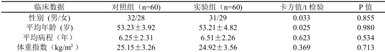 本研究采用随机对照试验设计,选取2023 年1 月至2024 年12 月在我院内分泌科就诊的120 例2 型糖尿病患者作为研究对象,将患者随机分为对照组和实验组,每组60 例。比较两组患者的基本资料,发现无统计学意义(P>0.05),对后续研究无影响,见表1.