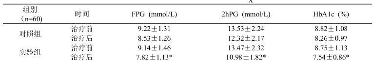 2.1 两组患者治疗前后血糖控制指标比较治疗后,实验组FPG、2hPG、HbA1c 水平均显著低于对照组 (P<0.05) ),见表 2。