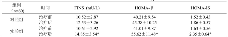 2.2 两组患者治疗前后胰岛功能指标比较实验组 FINS、HOMA-β和 HOMA-IS 改善程度显著优于对照组(P<0.05),见表 3。