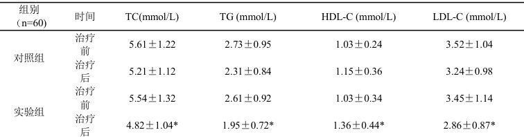 注:*表示与对照组比较P 值<0.05,具有统计学意义。2.3 两组患者治疗前后血脂指标比较两组血脂指标比较,实验组 TC、TG、LDL-C 水平显著低于对照组(P<0.05),HDL-C 水平显著高于对照组(P<0.05),见表 4。