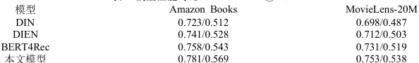 为验证模型性能,我们在公开数据集 Amazon Books 和 MovieLens-20M 上进行实验,对比基线模型(包括DIN、DIEN 和 BERT4Rec)。实验采用 AUC 和 NDCG@10 作为评估指标,结果如表 1 所示。