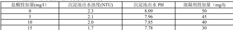 对以上数据进行对比分析,原水中投加盐酸量为15mg/l 时,聚合氯化铝(PAC)的投加量为30mg/l,此时沉淀池的出水浊度为 1.7NTU。原水中不投加盐酸时,聚合了绿化率(PAC)的投加量为30mg/l。通过对比可发现,向原水中投加盐酸来改变原水的PH 值可以达到节约混凝剂(聚合氯化铝)用量的目的。