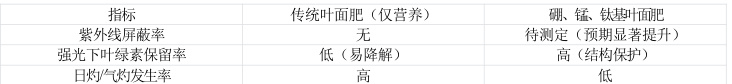 • 与国外研究的差异:首次将硼、锰、钛的光屏蔽特性应用于作物光胁迫防护