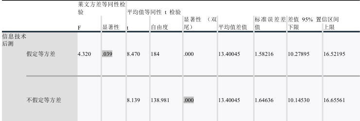 分析平台,运用双尾独立样本 t 检验(α=0.05)进行组间差异显著性检验,如表 3 所示。表 3 信息技术后测独立样本检验
