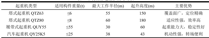 吊装设备的选型直接关系到预制构件能否安全,高效地完成吊装作业,设备选型过程需要综合考虑构件重量,吊装高度,作业半径以及现场施工条件等多项因素[2]。塔式起重机作为装配式建筑施工中的主要吊装设备,其选型参数包括最大起重量,最大起重力矩,最大工作半径等关键指标,这些参数的确定需要结合构件最大重量与最远吊装距离进行计算。履带式起重机虽然机动性相对较差但具有起重能力强,稳定性好的优势,特别适用于大型预制构件的吊装作业,其选型时需要重点关注额定起重量曲线与实际工况的匹配度,所以设备选型过程中还需要考虑吊装作业的安全裕度,通常要求设备的额定起重能力应为实际吊装重量的1.3-1.5 倍,确保在动载荷作用下仍能保持足够的安全储备。设备参数的确定还需要考虑施工现场的地质条件和空间限制因素,软弱地基条件下需要对起重机基础进行加固处理,狭窄场地则需要选择回转半径较小的设备型号,导致设备选型复杂化的另一个因素是多机协同作业的配合要求,大型预制构件往往需要两台或多台起重机协同吊装,这就要求各台设备在起重能力,作业半径,起升速度等方面具有良好的匹配性,避免因设备性能不匹配而影响施工效率和安全性(见表1)。