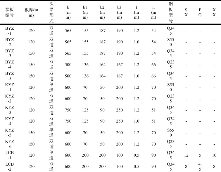 目前对压型钢板组合楼板、钢筋桁架楼承板和叠合式楼承板的研究主要集中在通过试验和有限元分析对其受力性能等方面的研究,对组合楼板在工程应用中的对比分析较少。本文将通过在不同楼板厚度、次梁布置工况下分别采用闭口型压型钢板组合楼板、开口型压型钢板组合楼板、钢筋桁架楼承板,对比分析三种组合楼板的单位面积用钢量,为实际工程应用提供参考。