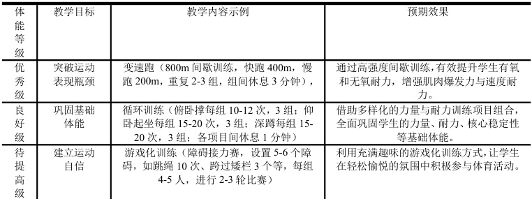 依据DeepSeek 所生成的详尽体能等级报告,本研究创新性地实施了“三级跳”教学模式,旨在精准契合不同体能层次学生的需求,全方位推动学生体能发展。