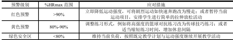 为确保学生在体育课堂中的运动安全与高效,本研究建立了科学严谨的“红黄绿”三级预警机制。该机制以学生的最大心率百分比作为关键指标,对课堂运动负荷进行精准把控。