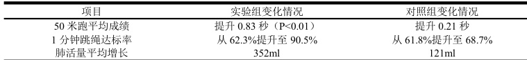 通过数据分析可以看出,实验组在 50 米跑、1 分钟跳绳达标率以及肺活量增长方面都明显优于对照组。