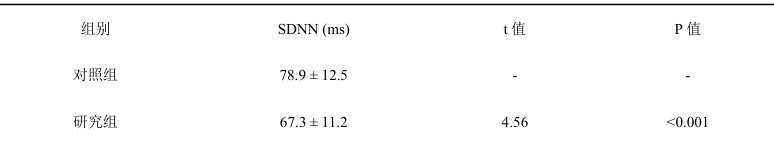 心率变异性指标 SDNN 作为心脏自主神经调节能力的重要标志,在本研究中显示出明显差异。研究组 SDNN值为 67.3 ms,低于对照组的 78.9ms ,且差异具有统计学意义(P<0.001)。较低的SDNN 反映了心脏自主神经系统调节能力下降,意味着合并病症患者可能存在更不稳定的心脏节律特征,这对长期预后提出了更高要求。