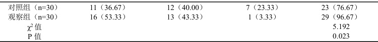 观察组总有效率为 96.67% ,高于对照组 76.67% (P<0.05) 。详见表 1。