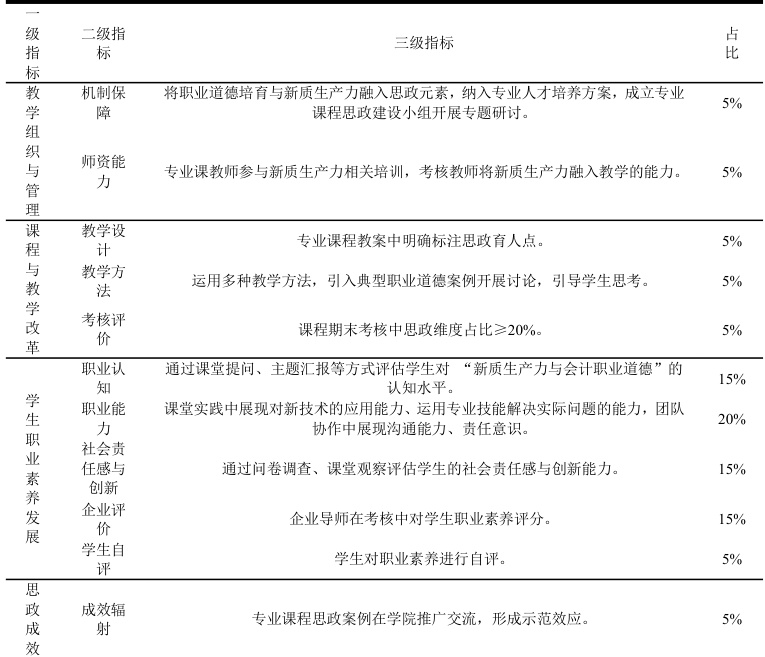 以新质生产力为背景,以人才培养效果为导向,以学生为中心,创新评价理念,通过可观测的行为指标量化思政成效,建立多维度评价指标体系[4]。聚焦大数据与会计专业学生的技术素养、职业道德、创新思维等核心素养,推动专业教育与思政教育深度融合,培养适应智能会计时代需求的高素质技术技能人才。