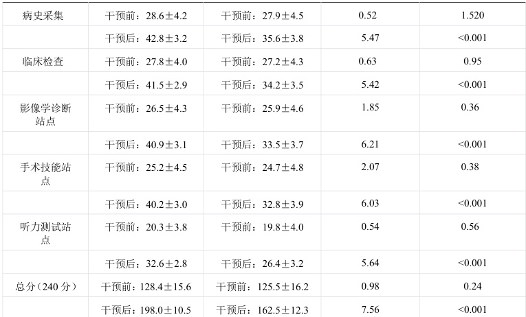 干预前,两组 OSCE 各站点成绩差异无统计学意义(P>0.05);干预后,实验组各项成绩及总分均显著高于对照组(P<0.05),且实验组自身前后对比提升更明显(表2)。