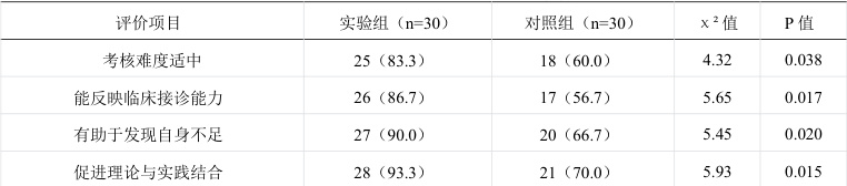 实验组对 OSCE 考核的认可度显著高于对照组(P<0.05),尤其在"考核反映真实临床能力"(86.7%vs56.7%)和"促进自主学习"(90.0%vs53.3%)方面差异明显(表2)。