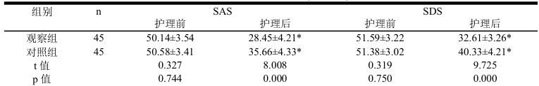 观察组护理后 SAS 及SDS 分数均低于对照组 (P<0.05) 。
