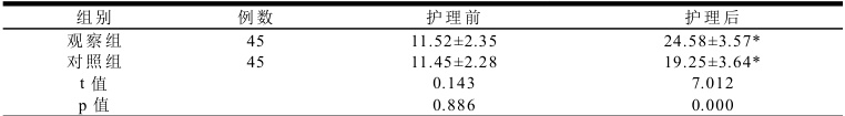 注:与本组干预前比较,*P<0.05。2.3 两组患者自我效能感对比观察组护理后自我效能感更强(P<0.05)