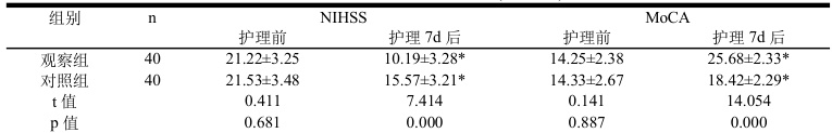 (1)在护理前和护理干预 7d 后,分别采用NIHSS 量表和MoCA 量表评估患者神经功能和认知功能。NIHSS考察范围包括意识水平、肢体运动等,分值 0-42 分;MoCA 包括命名、记忆、注意力等,总分30 分。评分与神经功能缺损程度及认知功能高低呈正相关关系。