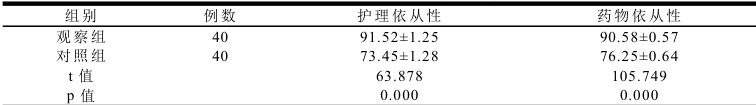 (2)护理 7d 后,对比两组患者康复依从性,采取百分制计分,评分标准如下:①护理依从性:体位配合(30 分)+康复训练参与(40 分)+基础护理配合(30 分);②药物依从性:口服药物服用(40 分)+注射/输液配合(30 分)+药物副作用反馈(30 分)。分数越高,说明康复依从性越强。