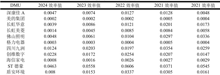 通过SPSS 软件对53 个家电行业上市公司的面板数据 择规模报酬可变的超效率SBM 模型,该模型测算方法的参数要求为决策单元 指标数量的乘积或者投入指标数量和产出指标数量和的 3 倍,因此选取 53 家企业 2 参数限制要求的,其在 2020—2024年的效率值见下表。