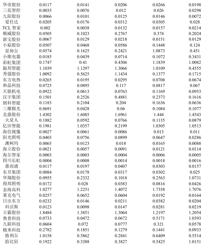 目前,中国家电企业在国际市场上已经占据了较大的市场份额,具备竞争优势,其生产规模居世界第一。在20 世纪后,家电市场趋近饱和,市场竞争日益加大,家电企业都面临着运用过程中高成本、低利润的问题,这些问题都会导致非期望指标增加,影响企业商业信用融资效率。此时,为了能够提高企业的商业信用融资效率,家电行业通过加快应付账款的流动率,提升企业短期偿债能力,提高营业利润等方面来实现,为满足资金周转需要,商业信用融资来缓解现金流压力,商业信用的成本相对较低,如果可以合理利用,降低家电行业融资成本。此外,良好的商业信用管理还能增强与上游供应商和客户的关系,促进长期合作,减少家电行业经营的波动性。但如果企业无法按时还款,必将影响信誉,甚至导致供应商停止供货,也会影响企业的商业信用融资效率。