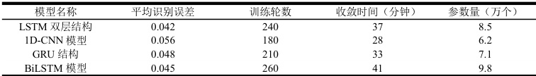 运行数据作为样本集,采样频率维持在10 秒/点。训练数据经归一化与时序分段后输入LSTM 网络结构,利用其对时间依赖序列的记忆特性构建损耗趋势判断通道。模型结构设置为两层LSTM 叠加网络,每层隐藏单元为64 个,激活函数采用ReLU 以保持梯度传播稳定。误差反馈机制以均方根误差(RMSE)控制收敛迭代次数,训练批量设置为128,动态调节梯度下降步长避免震荡问题[2]。训练输出结果与人工判别标签比对后,通过构建混淆矩阵对识别准确性进行量化。如下表1 为不同模型结构在油品损耗检测任务中的训练表现。
