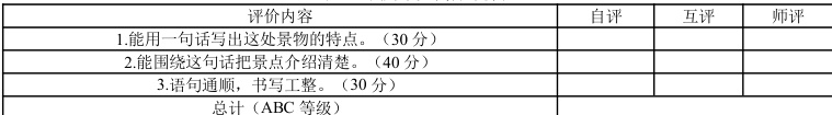 评价是连接教与学的重要环节,上述评价表紧扣单元语文要素“习作的时候,试着围绕一个意思写”进行设置,评价主体多元化。在完成海南美景的介绍过程中,学生明确知道自己要去哪里,发现自己的不足并随时对照评价表进行修改,学生能够调控自己的学习过程并完善学习结果。