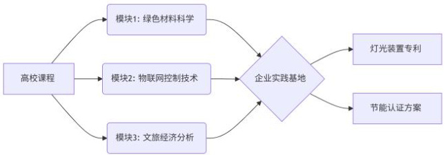 课程构建"高校-企业-认证机构"协同培养体系:在高校端设置绿色材料科学、物联网控制技术、文旅经济分析三大核心模块,通过企业实践基地实现知识转化。学生完成的光伏调光系统等作品,需同时满足WELL 建筑标准和LEED 城市认证的光污染控制要求。在认证端引入UL Ecologo 等国际标准,企业实践基地产出的灯光装置专利需通过碳足迹核查,形成"课程学习-实践验证-认证转化"的闭环。