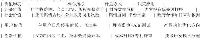 设计多维价值评估指标体系,将社会效益纳入决策模型: 经济价值层:广告收入、会员付费、IP 衍生收益等可直接货币化的指标,如芒果 TV 独播剧集的会员拉新成本回收周期。