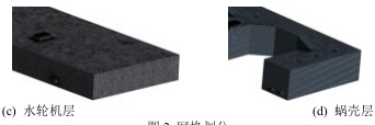 对主厂房各层计算模型进行网格划分,出口和入口网格尺寸设置为 0.05m,其他区域网格尺寸为 0.1m。网格结构如图 2 所示,整体网格质量良好,生成的网格总数量为1400 万