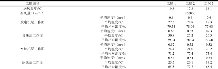 主厂房各层工作面的平均风速均满足设计要求。随着送风温度的减小,主厂房各层工作面的平均温度减小。工况1送风温度为19.6℃时,母线层工作面平均温度超出规定范围(≤30℃),因此在送风量为260000m3/h,送风温度应低于19℃。随着送风温度的升高,主厂房各层工作面的平均相对湿度降低。该组工况中发电机层工作面平均相对湿度全部超出规范要求(≤75%),工况1母线层和水轮机层工作面平均相对湿度超出规范要求,因此在夏季送风时,送风相对湿度应低于90%。2.2 第二组工况结果