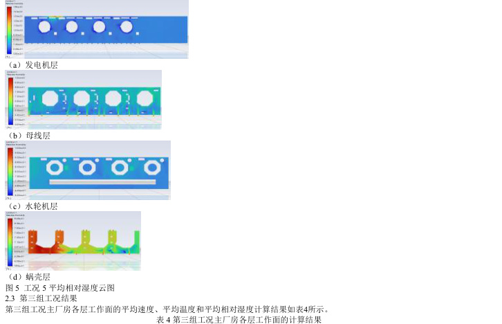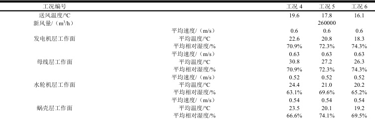 由于送风相对湿度为90%时,主厂房发电机层工作面平均相对湿度不符合规范要求,在第一组工况的基础上,现设通风洞除湿到85%,主厂房送风相对湿度为85%。主厂房各层工作面的平均速度、平均温度和平均相对湿度计算结果如表3所示。表3 第二组工况主厂房各层工作面的计算结果