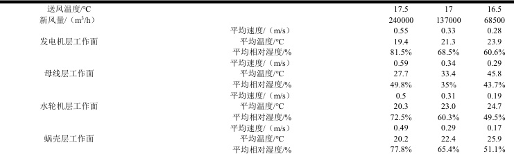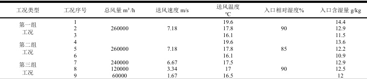 随着风量的减小,主厂房各层的相对湿度减小,这是因为新风量减小后,进入主厂房的水分也减少了。工况7发电机层工作面相对湿度为81.5%,超出规定范围(≤75%),因此在送风量为240000m3/h左右、送风温度17.5℃左右时,相对湿度应控制在90%以下。工况8和工况9各工作面的相对湿度均满足设计要求(≤75%)。