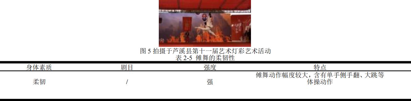 从这张照片中我们可以看到傩舞表演者双手上举傩面具,双腿在空中分开成一字,该节目的后半部分还有单手侧手翻等体操动作。傩舞是通过身体来代替语言表达的,所以傩舞动作幅度较大,涉及到伸展、旋转等动作,这就要求傩舞表演者们具有良好的柔韧性,特别是肩、腰、腿等部位。